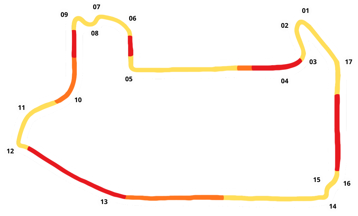 The long straights are overtaking hotspots – maximise slipstream and ERS usage to gain positions.